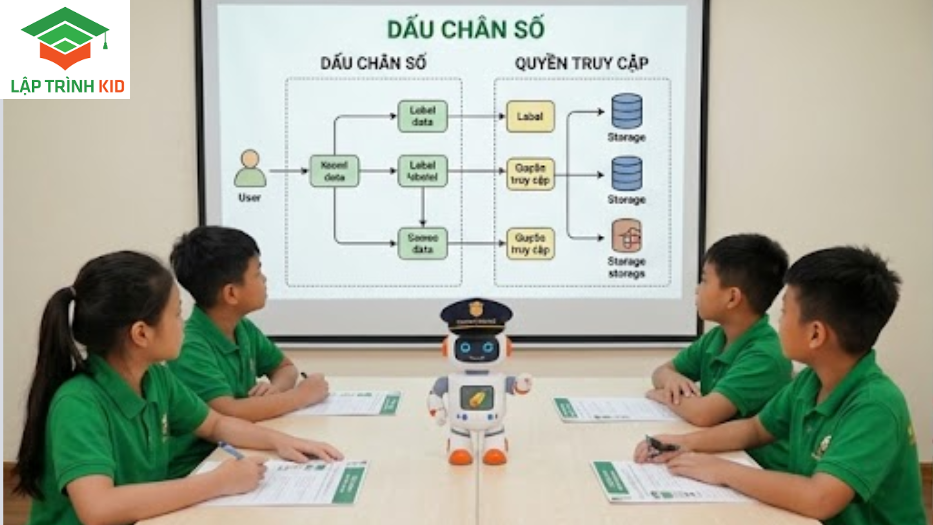 - Dấu chân số (Digital Footprint): Mọi thứ trẻ đăng tải, bình luận hoặc tìm kiếm đều để lại dấu vết vĩnh viễn trên máy chủ. Thông qua lập trình, trẻ hiểu rằng dữ liệu một khi đã được gửi đi (Submit) sẽ rất khó để thu hồi hoàn toàn. Từ đó, trẻ sẽ học cách suy nghĩ kỹ (Think before you post) trước khi chia sẻ hình ảnh hay thông tin cá nhân lên mạng xã hội.