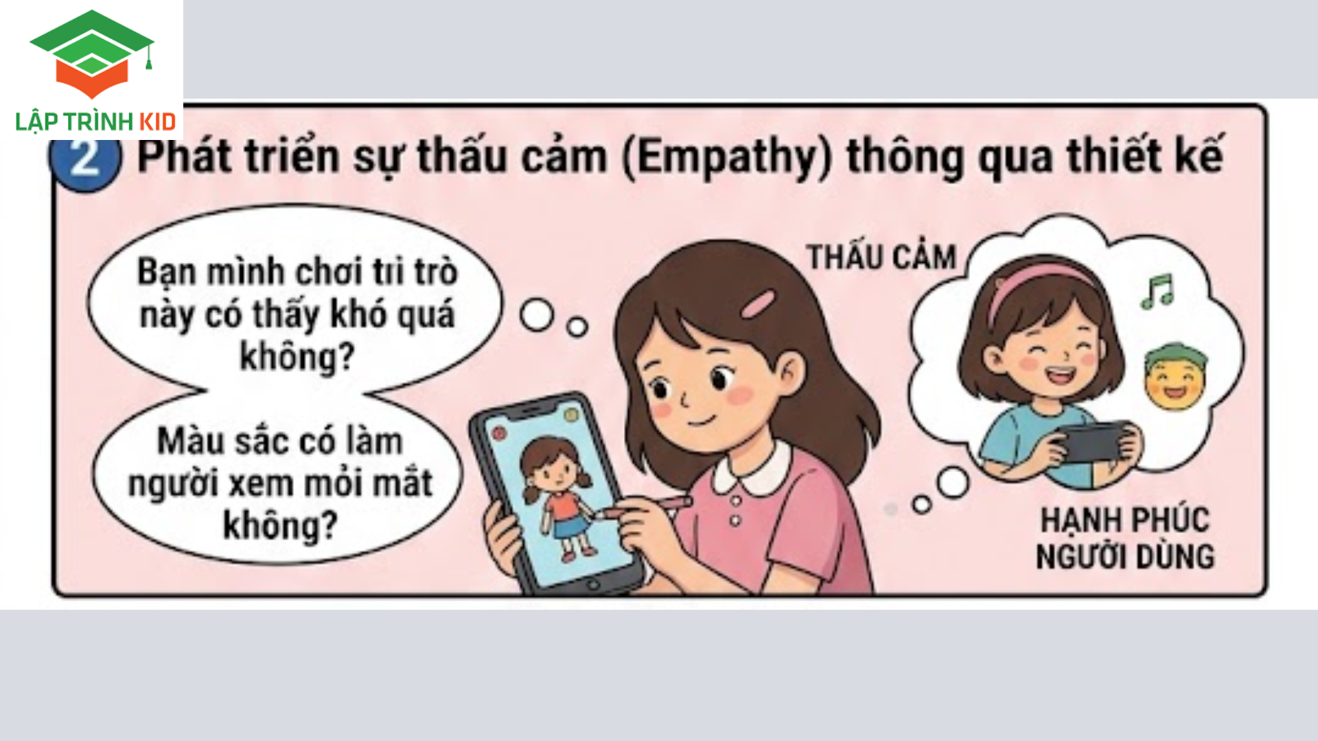 - Tư duy hướng về người dùng: Trẻ sẽ tự đặt ra những câu hỏi như: “Bạn mình chơi trò này có thấy khó quá không?”, “Màu sắc này có làm người xem mỏi mắt không?”, “Hướng dẫn này đã đủ dễ hiểu chưa?”.