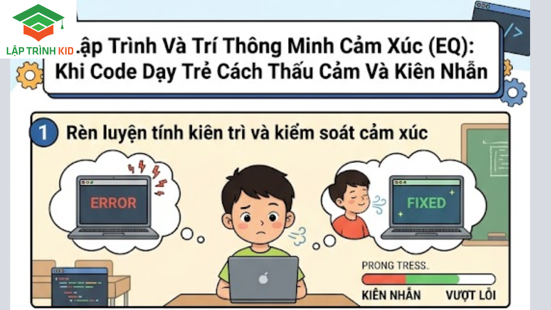 Việc trang bị EQ cho trẻ thông qua lập trình tại Lập trình KID chính là chuẩn bị cho con một “vũ khí” tối thượng mà không robot nào có thể thay thế được. Một lập trình viên có EQ cao sẽ tạo ra những ứng dụng nhân văn; một nhà lãnh đạo công nghệ có EQ cao sẽ xây dựng được những cộng đồng hạnh phúc.